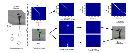 In this part of our research we propose a voting scheme in the space-time domain that allows both the temporal and spatial localization of activities. Our method uses an implicit representation of the spatiotemporal shape of an activity that relies on the spatiotemporal localization of ensembles of spatiotemporal features. The latter are localized around spatiotemporal salient points. We compare feature ensembles using a star graph model that compensates for scale changes using the scales of the features within each ensemble. We use boosting in order to create codebooks of characteristic ensembles for each class. Subsequently, we match the selected codewords with the training sequences of the respective class, and store the spatiotemporal positions at which each codeword is activated. This is performed with respect to a set of reference points, (e.g. the center of the torso and the lower bound of the subject) and with respect to the start/end of the action instance.