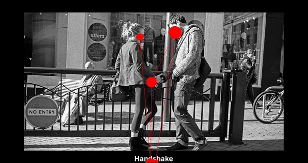 In the second part of the experiment, images or video fragments were shown together with a tag at the bottom of the screen. In some cases, the tag correctly described something about the situation. However, in other cases the tag did not actually apply to the media item. Below are two examples, overlayed with the eye tracking measurements as red dots and lines for gaze locations and shifts, respectively.