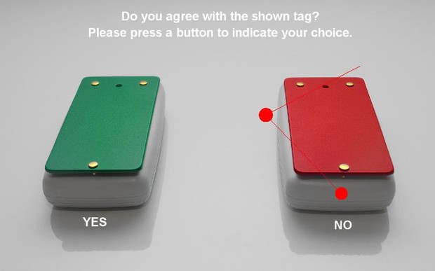 After each item, a participant was asked to press a green button if they agreed with the tag being applicable to the media item, or press a red button if not.