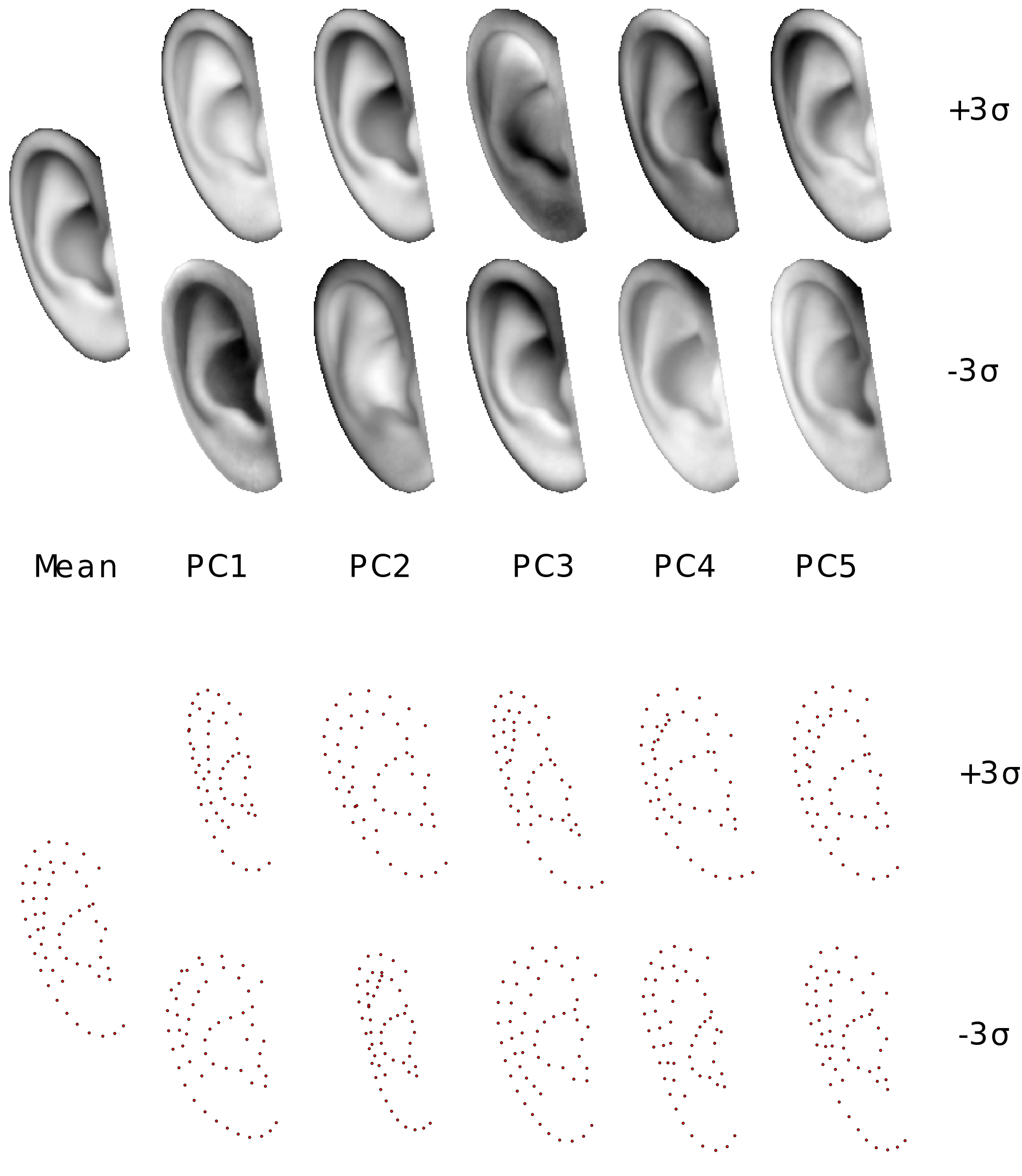 Fig. 1. Exemplar statistical shape and appearance model of human ear. The figure visualises the first five principal components variation in both models. Appearance model is created with pixel intensity for better visualisation.