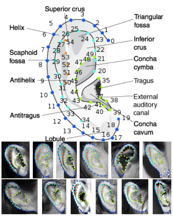 Collection A consists of 605 ear images “in-the-wild” collected from Google Images with no specific identity (by searching using the ear related tags). Each is manually annotated with 55 landmark points. Examples of such annotated images and the anatomy of pinna is shown in figure 2. The semantic meaning of the 55 landmarks are: ascending helix (0-3), descending helix (4-7), helix (8-13), ear lobe (14-19), ascending inner helix (20-24), descending inner helix (25- 28), inner helix (29-34), tragus (35-38), canal (39), antitragus (40-42), concha (43-46), inferio crus (47-49) and supperio crus (50-54). We randomly split the images into two disjoint sets for training (500) and testing (105). The purpose of Collection A is to build statistical deformable models with unconstrained ear samples.