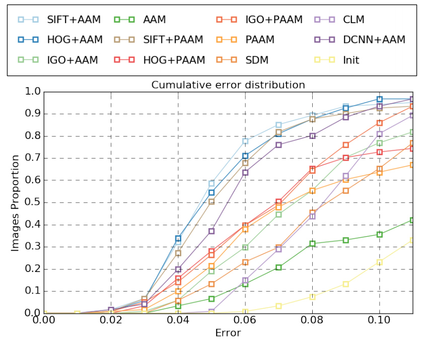 We evaluated the performance of many state-of-the-art methodologies including AAM, CLM and SDM using various kind of features. In particular, we employed pixel intensity (PI), dense SIFT (DSIFT) [27], dense HOG [17], IGO [38] and DCNN [34] features for both holistic and patch-based AAMs. The models were trained on a 3-level Gaussian pyramid. We kept [3,6,12] shape components for each level (low to high) and 90% of the appearance variance for all levels. Also discriminative models like Supervised Descend Method (SDM) [39] and Constrained Local Model (CLM) [16] are involved using features DSIFT [27].