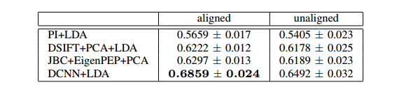 Overall performance over five folds is reported using mean accuracy (as in LFW). Experiments are performed under the image-restricted setting, where only binary positive or negative labels are given, for pairs of images. So the identity information of each image is not available under this setting and results are reported with both no outside training data and label-free outside data for alignment. Table 2 summarises the results. The top performance is around 68% using DCNN features and aligned images. As in the recognition experiments alignment always improves performance. Finally, Figure 4 plots the ROC curves for the tested methods.