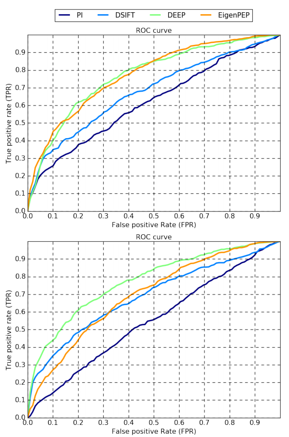 We used similar features as in the recognition experiments. In particular, we applied pixel intensities (PI), DSIFT and Deep Convolutional Neural Networks (DCNN) [35] (for DCNN we used the pre-trained VGG-16 architecture). High dimensional features, such as DSIFT, were combined with PCA for dimensionality reduction. For each pair of the training images and for each feature we computed the squared distance and formed a vector which was fed to a two class LDA or SVM which separate match versus not-match pairs. We apply the above methods to both aligned and non-aligned ear samples. Finally, we also applied the methodology that was proposed in [26] (so-called Eigen-Pep).